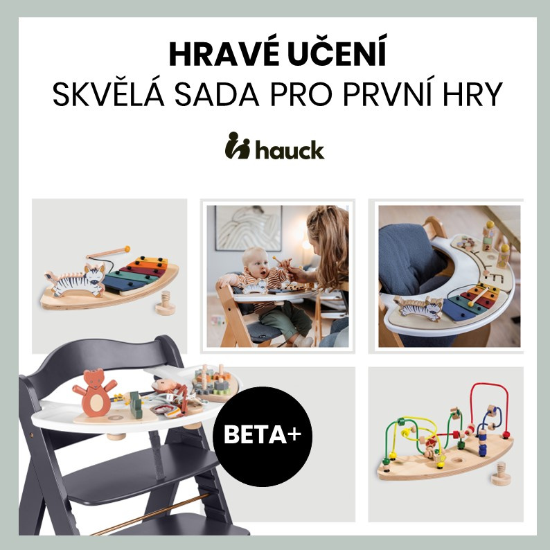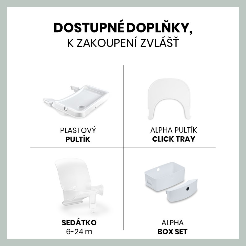 ZÁBAVNÉ UČENÍ HROU // Na židličku lze připevnit pult s hračkou, v nabídce máme ALPHA PLAY MOVING SET a ALPHA PLAY MUSIC SET. Sada umožňuje ještě flexibilnější využití jídelní židličky. Hrací pultík se jednoduše nacvakne na přední tyč židličky. Hraním na xylofon nebo přesouváním dílků trénuje vaše děťátko logické myšlení, hudební rytmus a koordinaci mezi zrakovým vnímáním a jemnou motorikou.