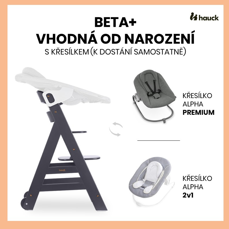 VHODNÁ JIŽ OD NAROZENÍ PŘI POUŽITÍ KŘESÍLKA (DOSTUPNÉ SAMOSTATNĚ) // V kombinaci s křesílkem 2v1 můžete jídelní židličku Beta+ používat již od narození. Křesílko je možné použít jako nástavec na židličku nebo při použití rámu jako samostatné křesílko.