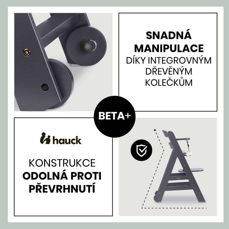 Jídelní židlička Beta+ je vyrobena z evropského bukového dřeva pocházejícího z lesů s certifikátem FSC®, který oceňuje trvale udržitelné a ekologické lesní hospodaření na ochranu rostlin a zvířat. Díky stabilní konstrukci s integrovanými kolečky a podlahovými kluzáky je Beta+ mimořádně odolná proti překlopení.