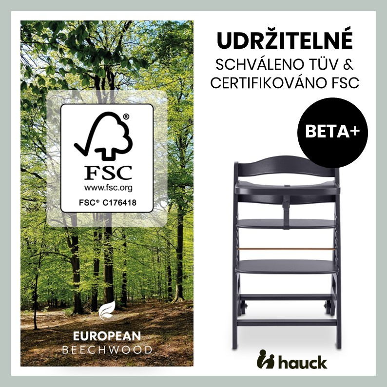 UDRŽITELNÉ BUKOVÉ DŘEVO S CERTIFIKÁTEM FSC® // Jídelní židlička Beta+ je vyrobena z evropského bukového dřeva pocházejícího z lesů s certifikací FSC®, která oceňuje udržitelné a ekologické lesní hospodářství na ochranu rostlin a živočichů.