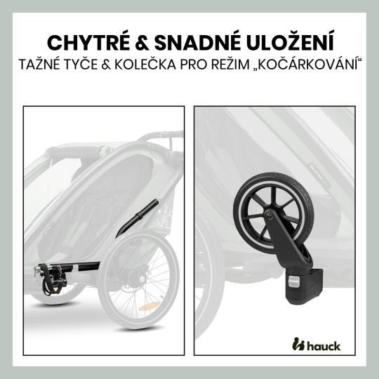Přizpůsobte cyklovozík svému stylu - Na procházky, jízdu na kole nebo na sport – multifunkční cyklovozík BIKE N WALK DUO je připraven na jakýkoli způsob jízdy. Součástí balení je tažná tyč, ochrana kol, praporek, kolo na procházky i sportovní kolo a pumpička – vše v jedné krabici k dispozici pro váš aktivní životní styl. Cyklovozík snadno přestavíte v několika krocích a stejně snadno jej složíte pro uskladnění.