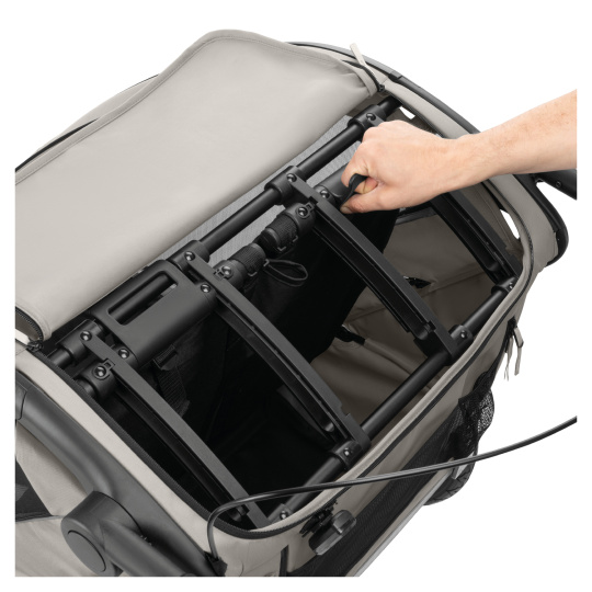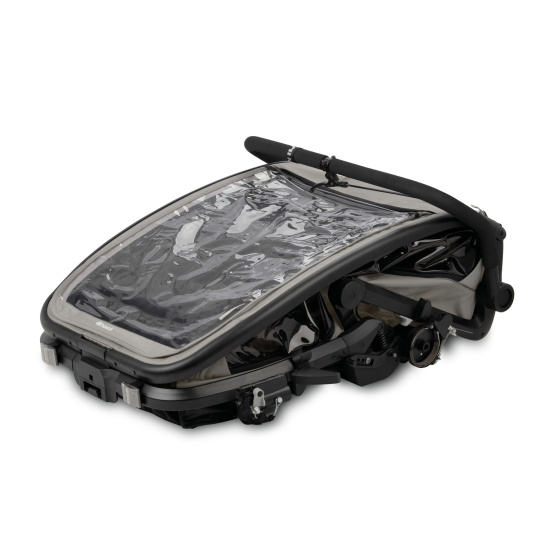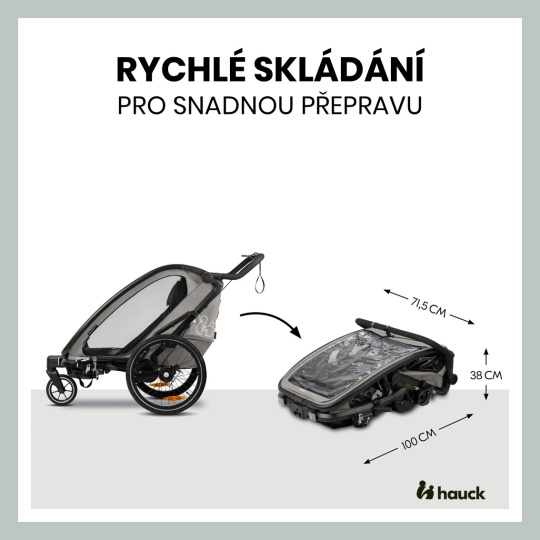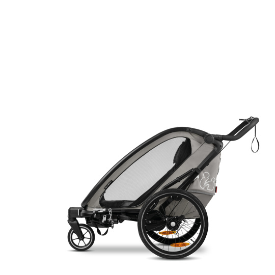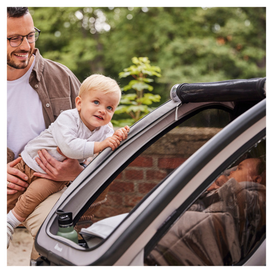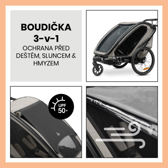 Dobrá ochrana - Cyklovozík má odnímatelná tónovaná boční okna a stříšku 3v1 která poskytuje ochranu před větrem, sluncem a hmyzem – skládá se z pláštěnky, sluneční clony s UV 50+ ochranou a síťky, která poskytuje dostatečný přísun vzduchu. Ve sportovním režimu máte nad vozíkem plnou kontrolu díky ruční brzdě a bezpečnostnímu pásku na ruku, při běžné jízdě lze také aplikovat nožní brzdu.