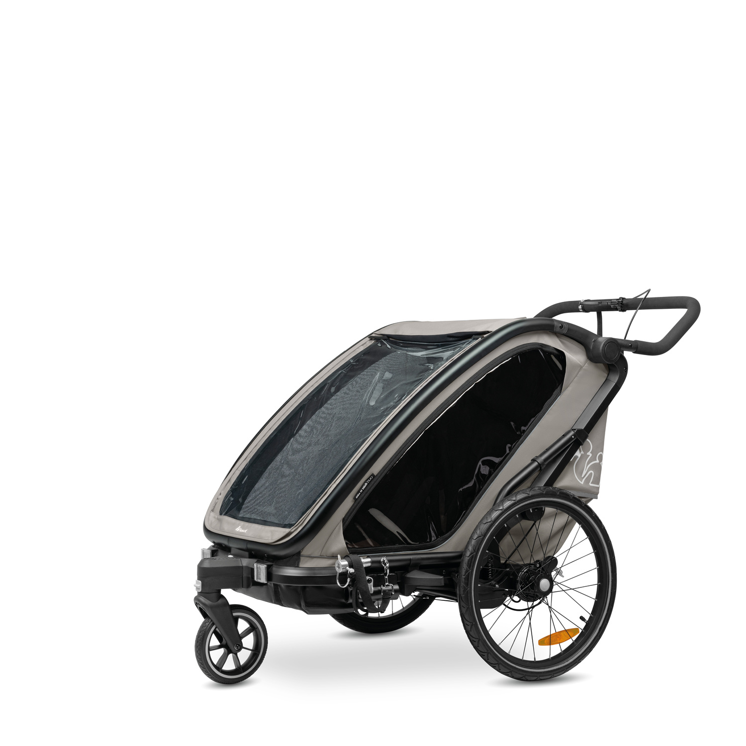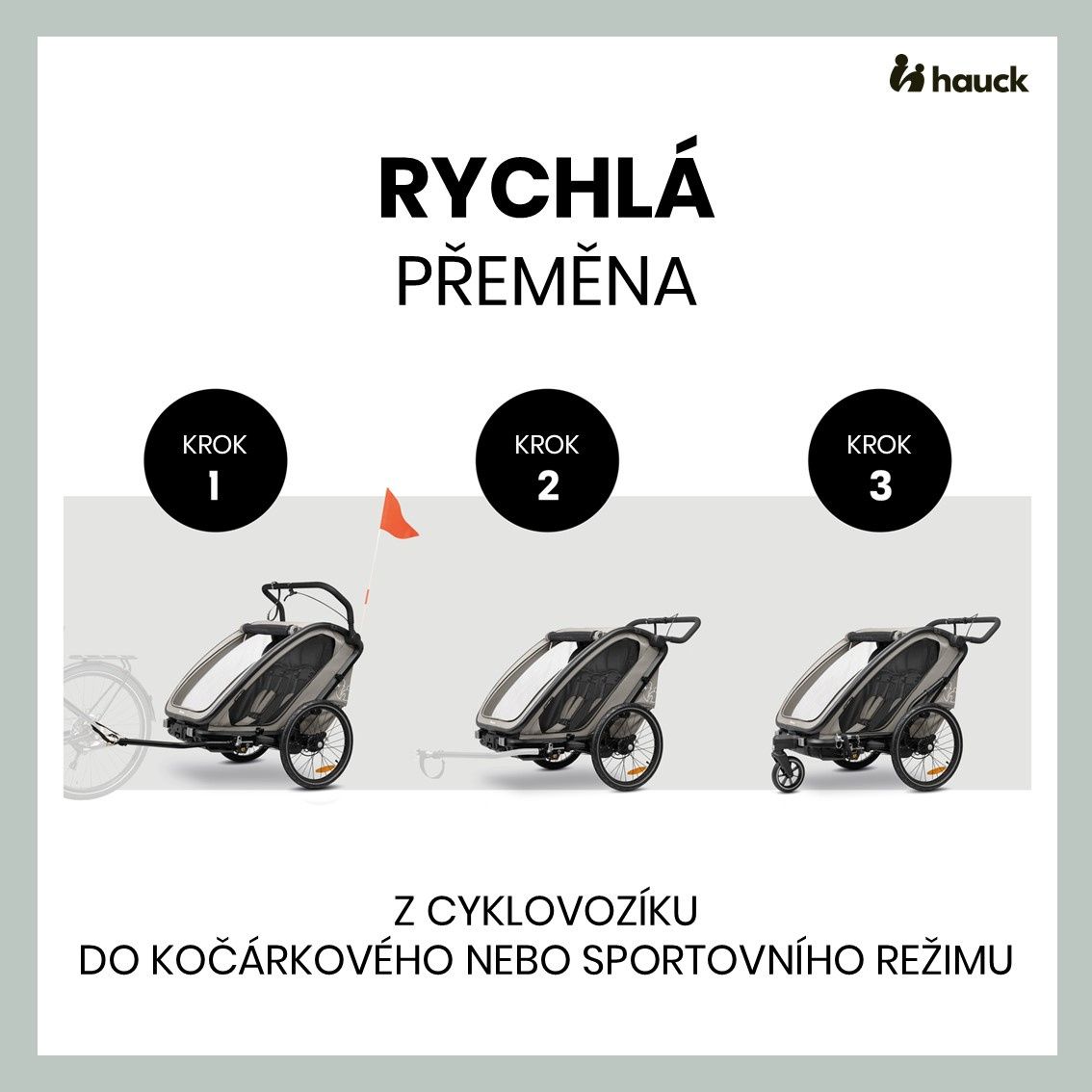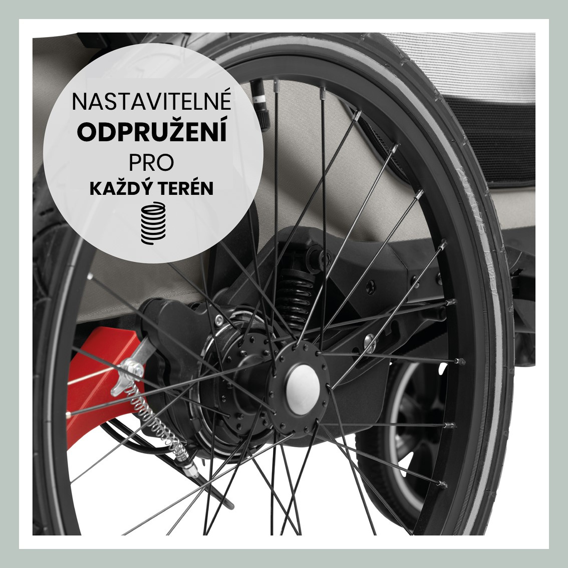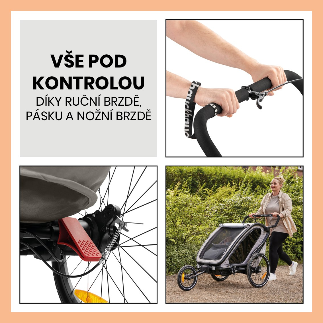 Dobrá ochrana - Cyklovozík má odnímatelná tónovaná boční okna a stříšku 3v1 která poskytuje ochranu před větrem, sluncem a hmyzem – skládá se z pláštěnky, sluneční clony s UV 50+ ochranou a síťky, která poskytuje dostatečný přísun vzduchu. Ve sportovním režimu máte nad vozíkem plnou kontrolu díky ruční brzdě a bezpečnostnímu pásku na ruku, při běžné jízdě lze také aplikovat nožní brzdu.