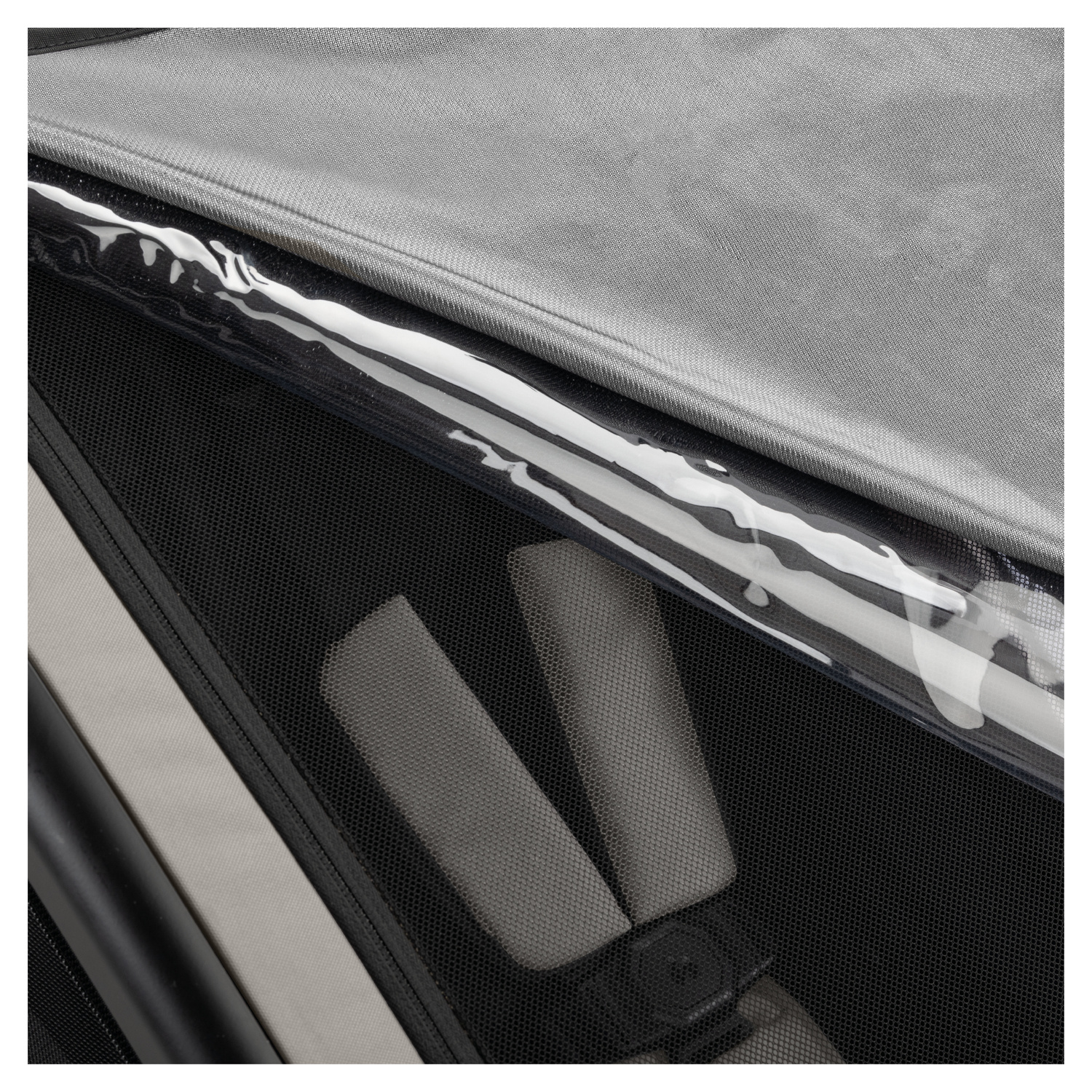 OCHRANA PŘED SLUNCEM, VĚTREM A NEPŘÍZNIVÝM POČASÍM // Se stříškou 3v1 která obsahuje pláštěnku, sluneční clonu (s UV 50+ ochranou) a síťovinu jste v bezpečí před větrem, sluncem i hmyzem – s opravdu velmi dobrou ventilací pro dostatečný přísun vzduchu a odnímatelnými tónovanými bočními okny.