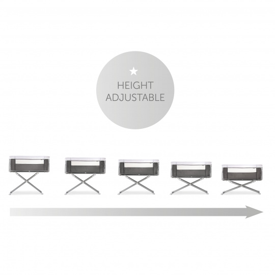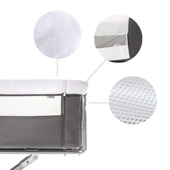 Vzhledem k 5-násobnému nastavení výšky a dodatečně vyjímatelné boční části může být Face to Me přizpůsoben všem rodičovským postelím.
