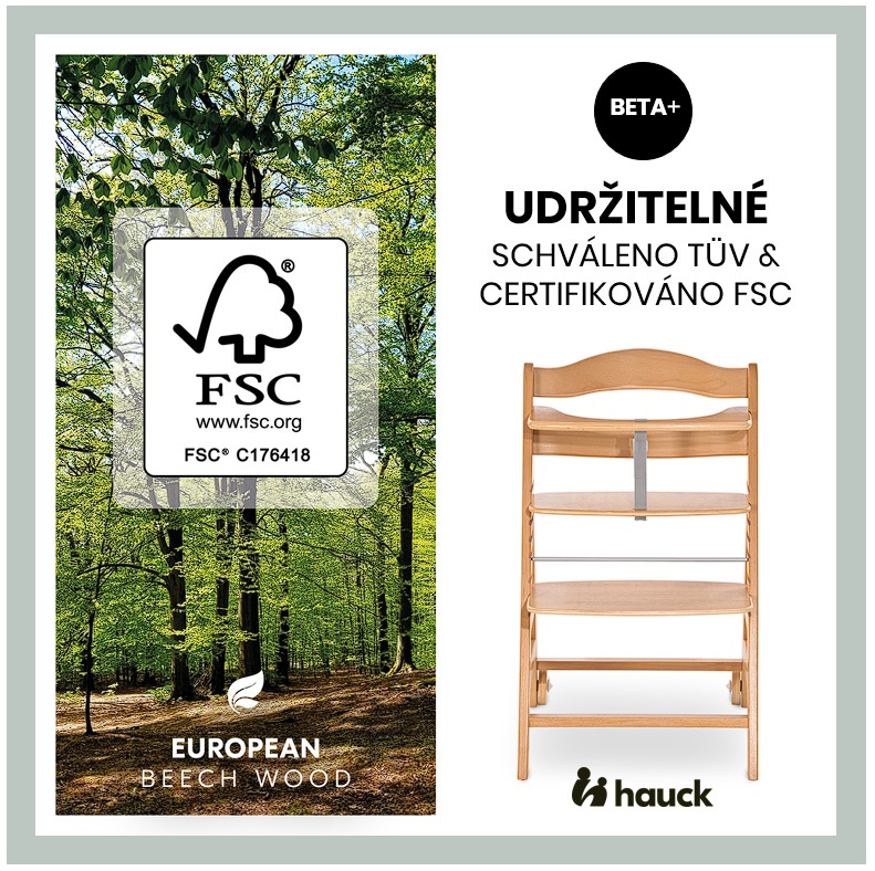 UDRŽITELNÉ BUKOVÉ DŘEVO S CERTIFIKÁTEM FSC® // Jídelní židlička Beta+ je vyrobena z evropského bukového dřeva pocházejícího z lesů s certifikací FSC®, která oceňuje udržitelné a ekologické lesní hospodářství na ochranu rostlin a živočichů.