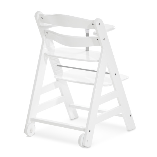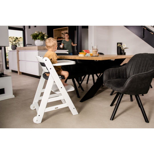STABILNÍ KONSTRUKCE S INTEGROVANÝMI DŘEVĚNÝMI KOLEČKY // Stabilní konstrukce a kolečka tvoří ideální kombinaci, díky které je židlička odolná proti převrhnutí. Když se vaše dítě odrazí od stolu, židlička se jednoduše mírné odsune dozadu.
