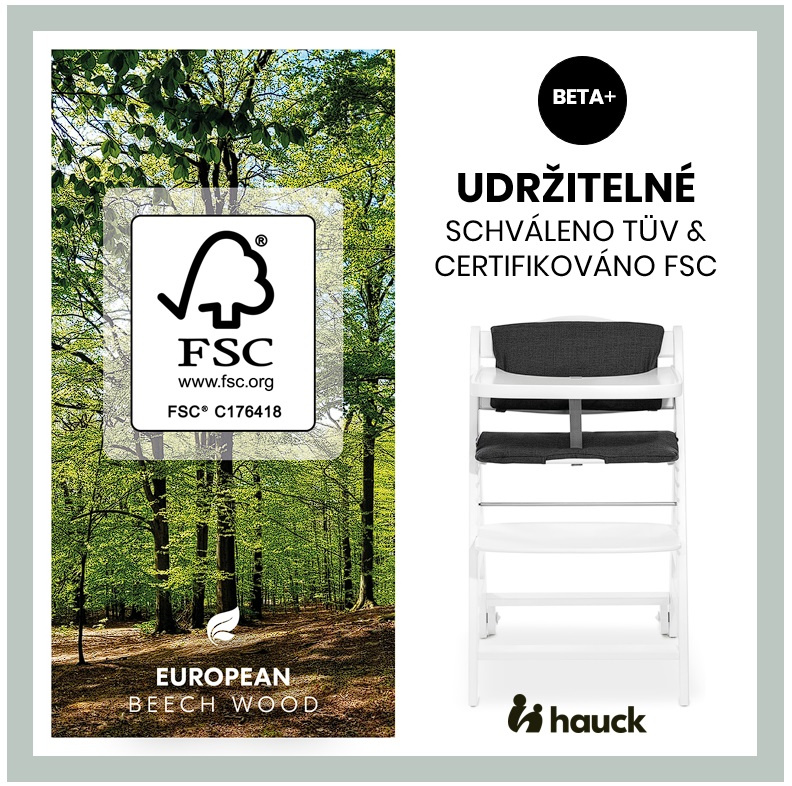 UDRŽITELNÉ BUKOVÉ DŘEVO S CERTIFIKÁTEM FSC® // Jídelní židlička Beta+ je vyrobena z evropského bukového dřeva pocházejícího z lesů s certifikací FSC®, která oceňuje udržitelné a ekologické lesní hospodářství na ochranu rostlin a živočichů.