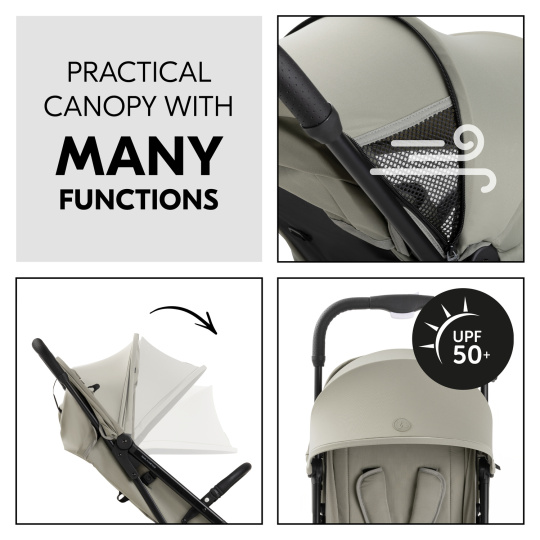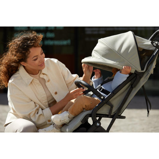 Díky odpružení tlumícímu nárazy a kolečkům pro hladkou jízdu odolným proti propíchnutí si vaše dítě užije pohodlnou jízdu. Rychlé manévrování nákupním centrem je díky otočným kolečkům hračkou. Když chce vaše dítě spát, můžete jednoduše sklopit opěrku zad jednou rukou. Sluneční stříška s UV ochranou 50+ nabízí příjemný stín, zatímco síťovaná okénka poskytují dostatečnou cirkulaci vzduchu.
