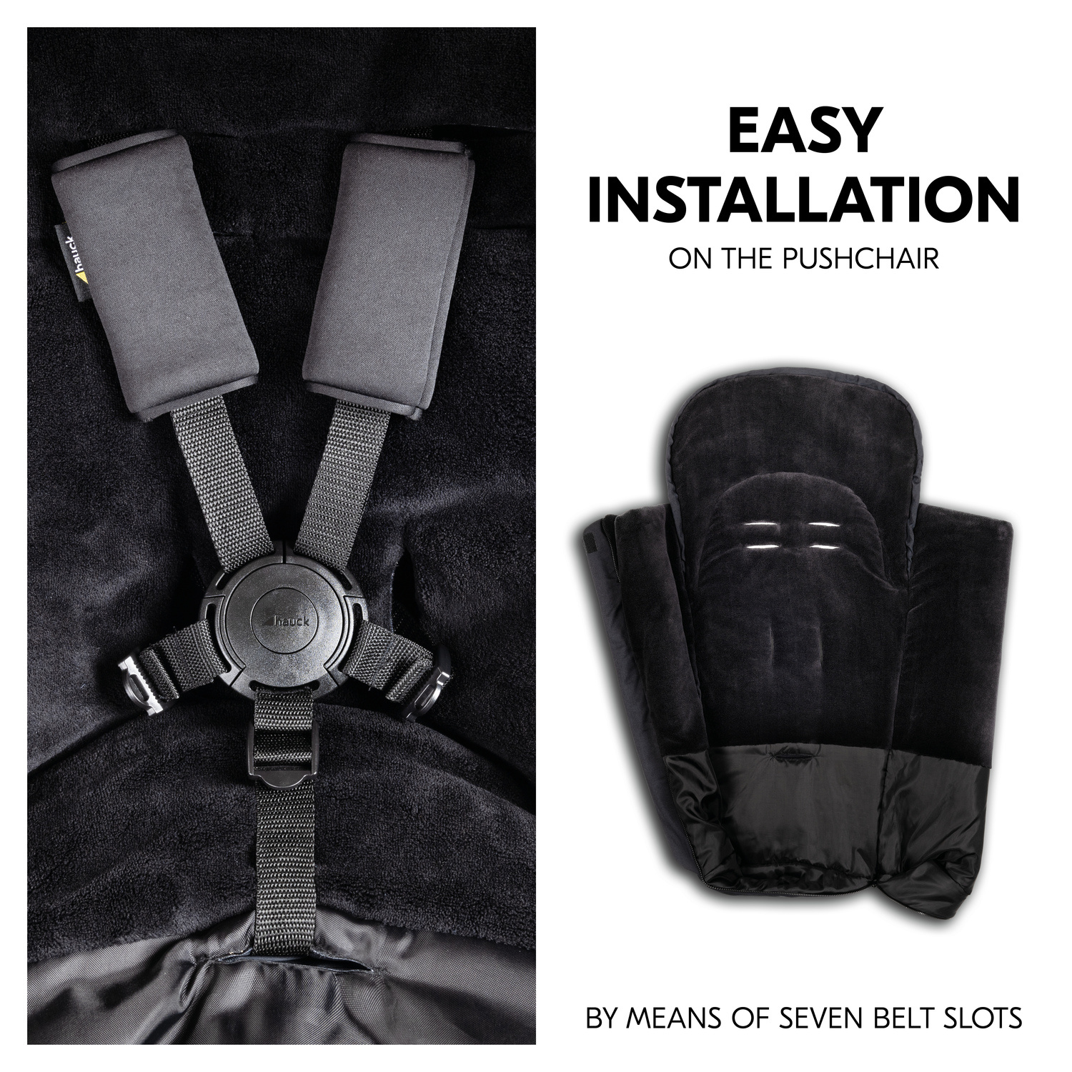 Díky sedmi otvorům pro pásy lze prostorný fusak snadno a rychle nainstalovat na kočárek, a to i v případě, že pětibodové pásy mají různou výšku. Protiskluzová vrstva na spodní straně poskytuje dodatečnou bezpečnost a zajišťuje, že fusak zůstane během cesty na svém místě.