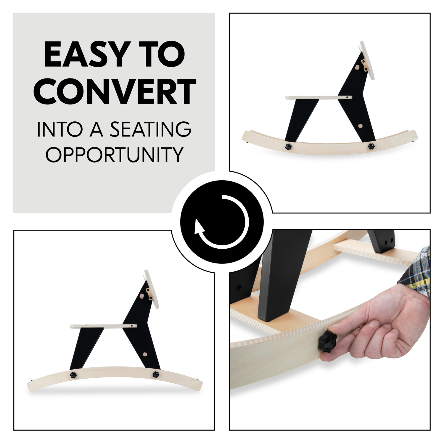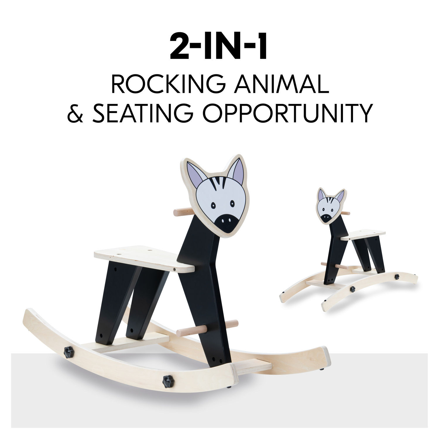 SNADNÁ PŘEMĚNA NA SEDÁTKO // Houpadlo lze snadno a rychle odejmout, otočit a bezpečně přišroubovat zpět na místo, čímž se houpací zvířátko promění ve skvělé místečko k sezení pro vaše dítě.