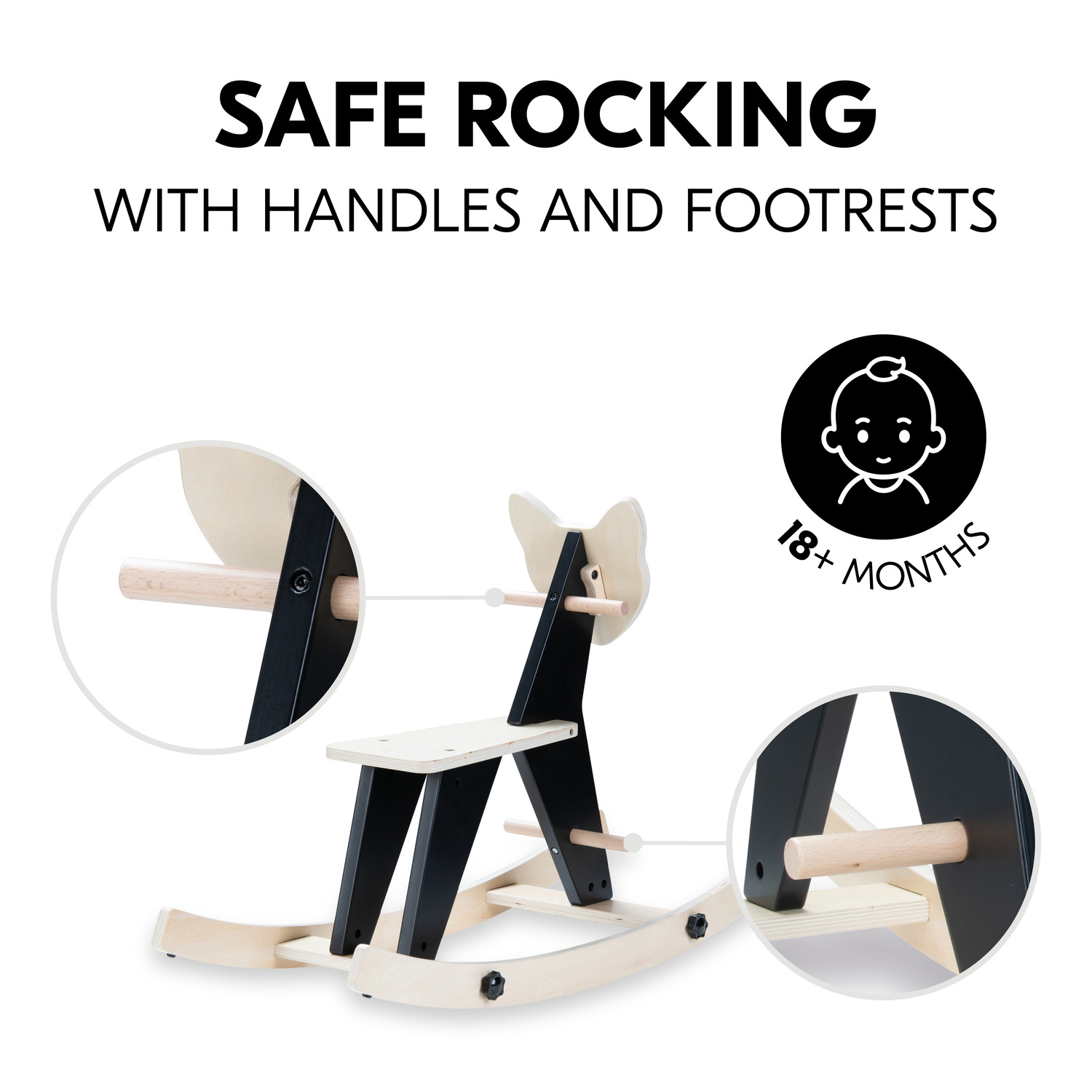 BEZPEČNÉ HOUPÁNÍ S DRŽÁTKY A OPĚRKAMI PRO NOŽIČKY // Díky držadlům a opěrkám na nožičky se vaše dítě může houpacího zvířátka vždy bezpečně přidržovat a houpat se dopředu a dozadu. Vhodné od 18 měsíců.