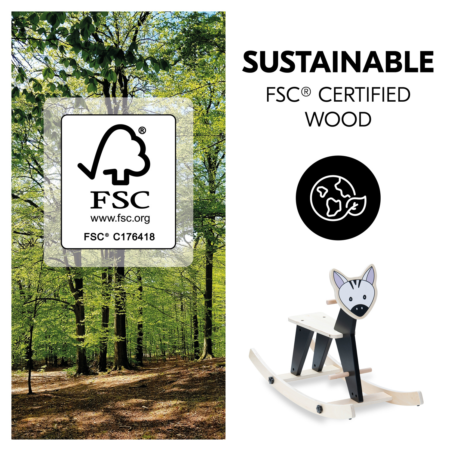 DŘEVO S CERTIFIKACÍ FSC® PRO ZDRAVĚJŠÍ ŽIVOTNÍ PROSTŘEDÍ // Houpací zvířátko je vyrobeno z odolného dřeva, které pochází z lesů s certifikátem FSC®, který zaručuje udržitelné a ekologické využívání lesů chránící rostliny a zvířata.