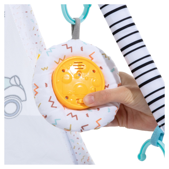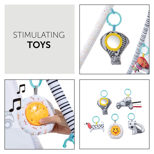 MNOŽSTVÍ STIMULUJÍCÍCH HRAČEK // Hrací stan s hrazdičkou umožňuje připevnění 5 různých veselých závěsných hraček tak, aby je mělo děťátko na dosah. Díky těmto roztomilým závěsným hračkám může děťátko poslouchat zvuky*, objevovat svůj vlastní odraz nebo poslouchat hudbu*.