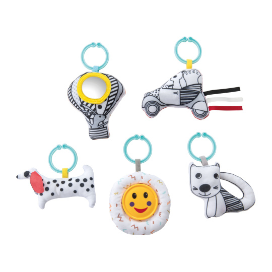 Jakmile děťátko začne lépe rozpoznávat své okolí, nabízí hrazdička pět závěsných hraček pro stimulaci hmatu a sluchu. Závěsné hračky hrají, šustí nebo odráží obraz děťátka a tím pomáhají ke stimulaci jeho smyslů. Navíc je možné měnit polohu nebo výšku závěsných hraček podle potřeby děťátka.