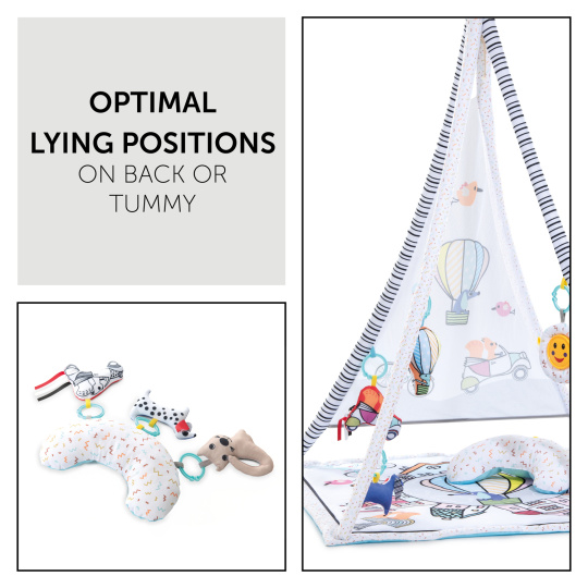 IDEÁLNÍ MÍSTEČKO PRO HRANÍ V LEŽE // Velká hrací deka nabízí vašemu novorozenci stabilní místečko na ležení. Díky polštářku ve tvaru půlměsíce může vaše děťátko cvičit i polohu na bříšku.
