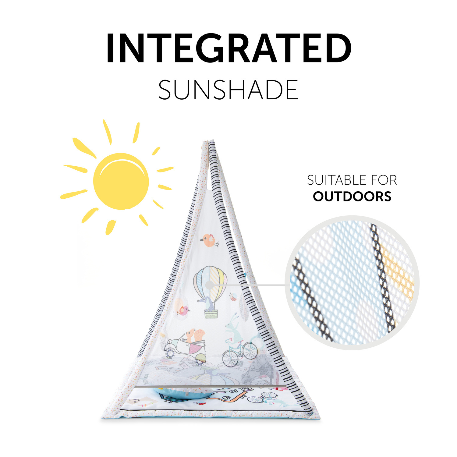 DĚTSKÝ STAN SE SLUNEČNÍ CLONOU // Díky integrované sluneční cloně, která nabízí dodatečnou ochranu proti slunci, lze hrací deku používat uvnitř i venku, což umožňuje bezstarostnou zábavu při hraní, ať jste kdekoli.