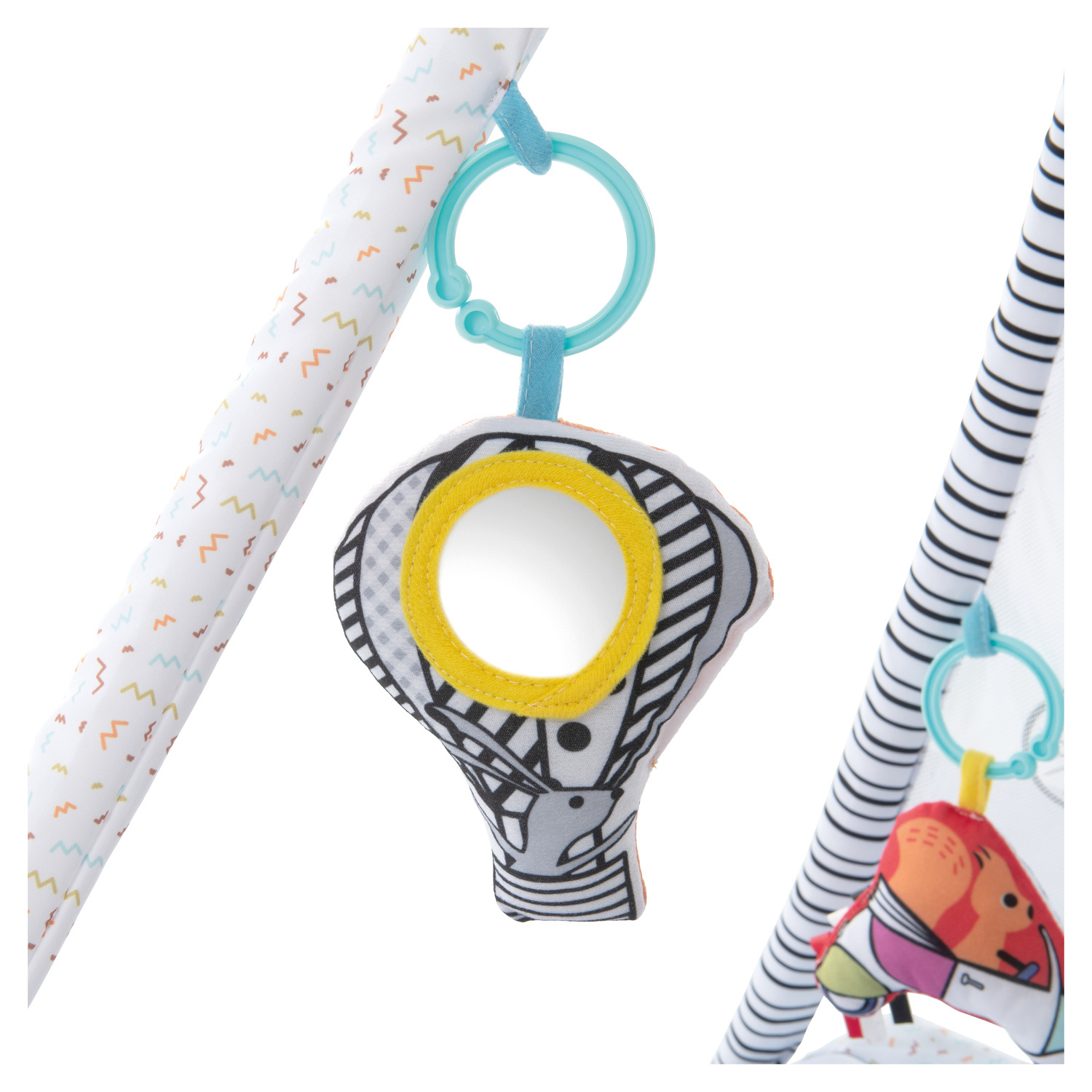 MNOŽSTVÍ STIMULUJÍCÍCH HRAČEK // Hrací stan s hrazdičkou umožňuje připevnění 5 různých veselých závěsných hraček tak, aby je mělo děťátko na dosah. Díky těmto roztomilým závěsným hračkám může děťátko poslouchat zvuky*, objevovat svůj vlastní odraz nebo poslouchat hudbu*.