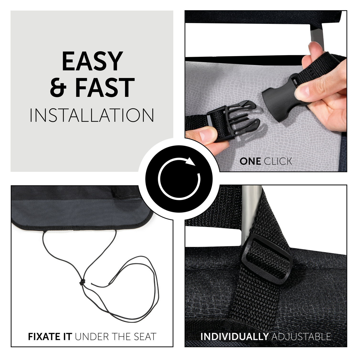 Snadné připevnění // Organizér se spolehlivě připevní na sedadlo automobilu, a to pomocí individuálně nastavitelných přesek a pásků. Pokud již není potřeba, může se složit a uložit v automobilu, aniž by zabral příliš mnoho místa.