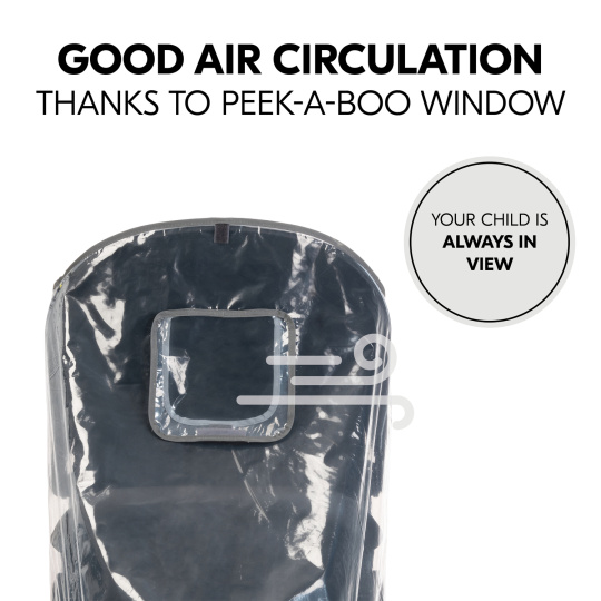 SNADNÝ VSTUP DÍKY VELKÉMU OKÉNKU NA ZIP // Když vaše dítě potřebuje nastoupit nebo vystoupit z kočárku, můžete přední část pláštěnky snadno otevřít pomocí zipu.