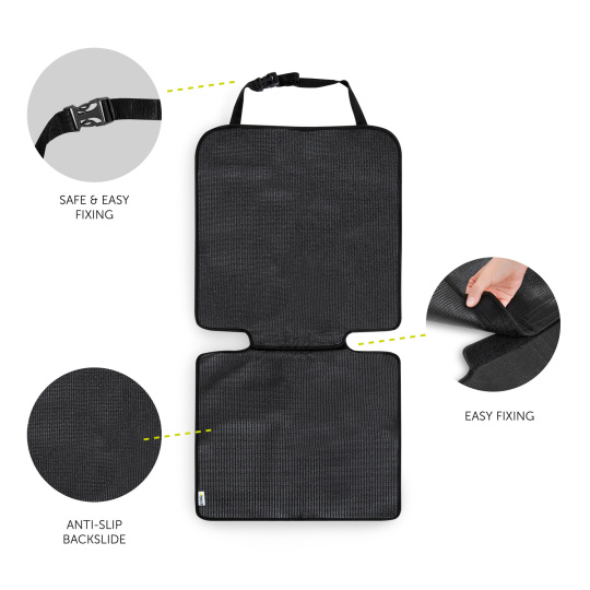 Ochrana potahů autosedadla // Perfektní ochrana potahů autosedadla proti otlačeninám a odřeninám, které způsobují dětské autosedačky. Univerzální podložka má na obou stranách protiskluzový a strukturovaný povrch, který zabrání nechtěným pohybům autosedačky tam a zpět, což zvyšuje stabilitu a bezpečnost. Díky otvorům na Isofix je vhodný do automobilů s přípojkami Isofix.