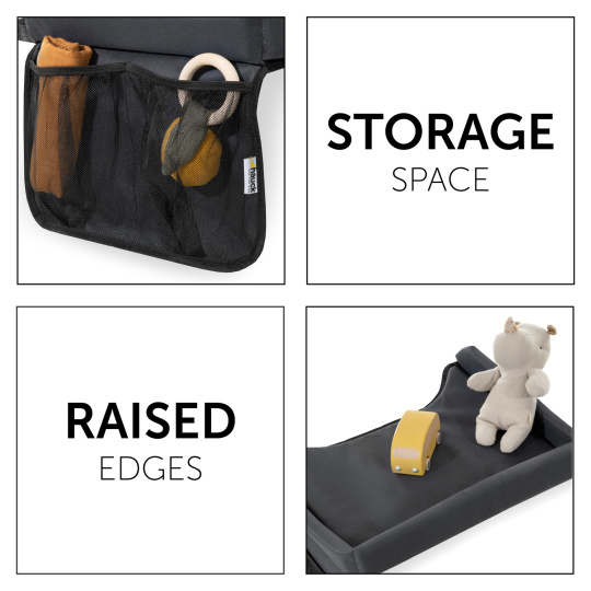 Na dlouhé cesty // Tento měkce polstrovaný hrací stůl má otvory na bříško a s plochou ca. 40 x 35 cm nabídne dostatek místa na ty nejoblíbenější hračky. Vyvýšený okraj zabrání vyklouznutí hraček ze stolku. Play On Me je omyvatelný, lze složit a v nutných případech zaručí přístup k dítěti.