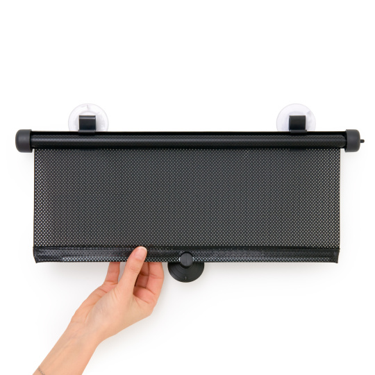 Jednoduché připevnění // Roletu lze připevnit buď pomocí dvou věšáčků s háčkem přímo na okno vozidla, nebo pomocí extra silné přísavky na okenní tabuli. Tato sluneční ochrana se vyroluje zmáčknutím tlačítka po straně vodící lišty. 2 ks v balení.