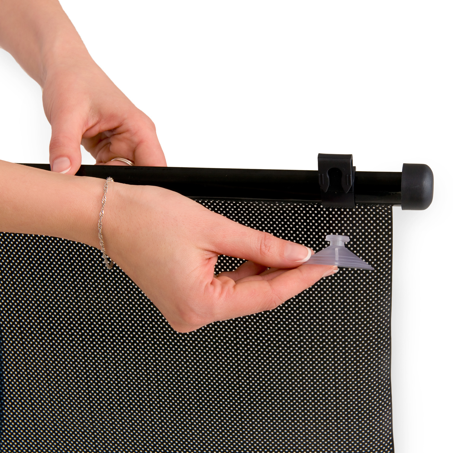 Jednoduché připevnění // Roletu lze připevnit buď pomocí dvou věšáčků s háčkem přímo na okno vozidla, nebo pomocí extra silné přísavky na okenní tabuli. Tato sluneční ochrana se vyroluje zmáčknutím tlačítka po straně vodící lišty. 2 ks v balení.