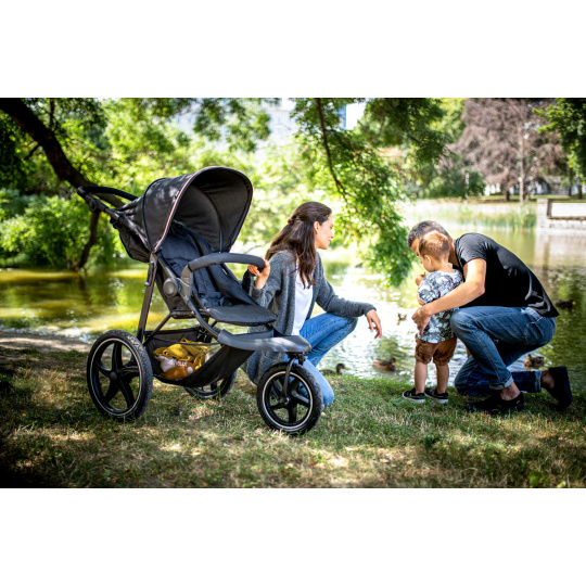 Robustní terénní kočárek // Vyrazte ven s tímto terénním fešákem za rodinným dobrodružstvím. Extra velká nafukovací kola zaručí jízdu s minimem otřesů. Kočárek díky otočnému kolu mistrovsky zdolá úzké zatáčky.
