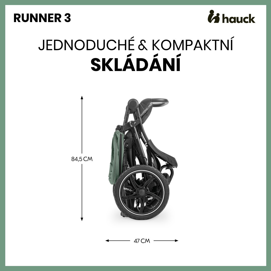 SNADNÉ SKLÁDÁNÍ // Chystáte se na výlet, není nic snadnějšího, kočárek RUNNER 3 se skládá velmi snadno. V případě potřeby lze odejmout kolečka pro ještě větší kompaktnost.