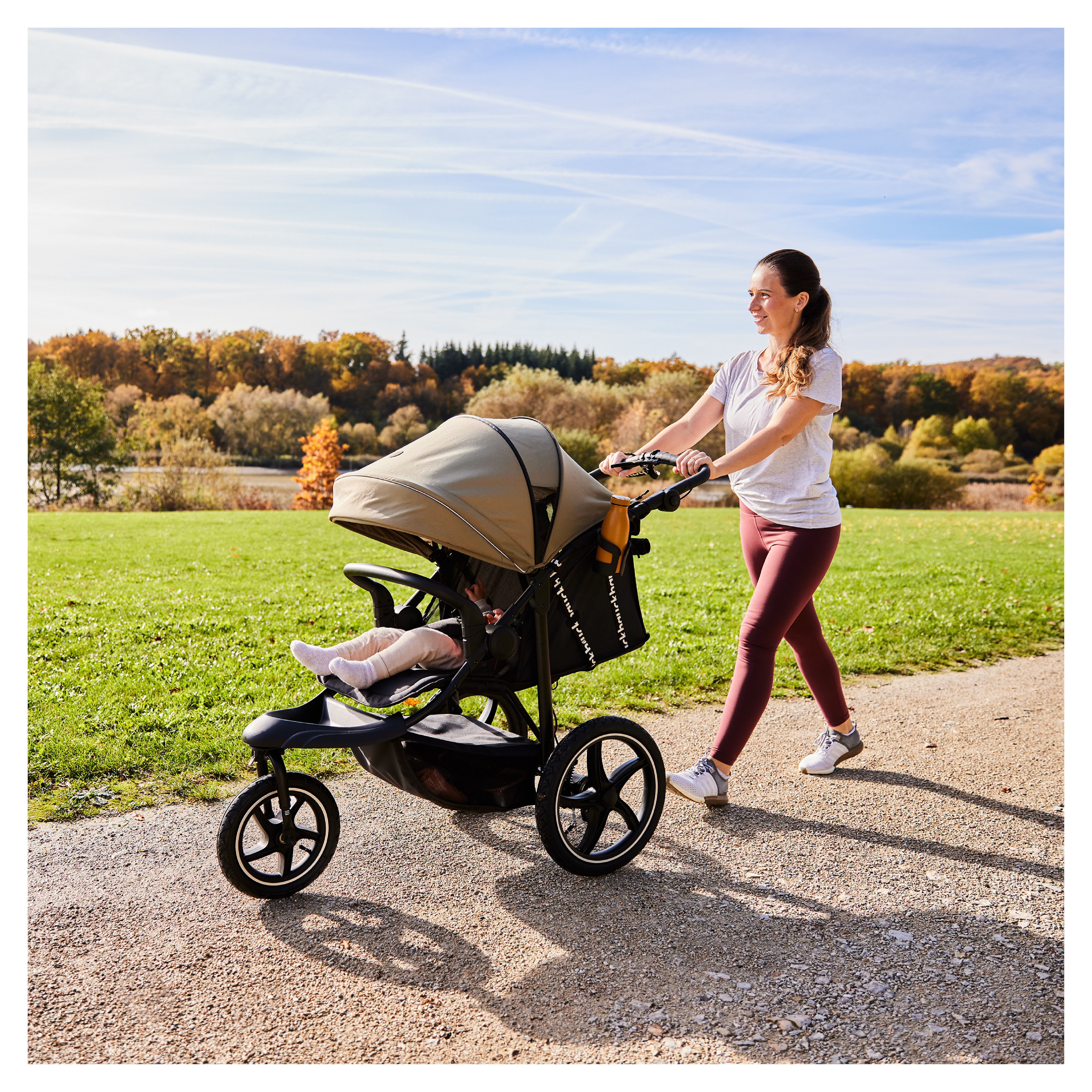 S NAFUKOVACÍMÍ XL KOLY A ODPRUŽENÍM // 3x odpružená nafukovací kola vhodná do každého terénu: Robustní kočárek RUNNER 3 s dvojitým nastavitelným zadním odpružením a předním uzamykatelným kolem vás doveze téměř kamkoli. Ideální pro vaše dobrodružství!