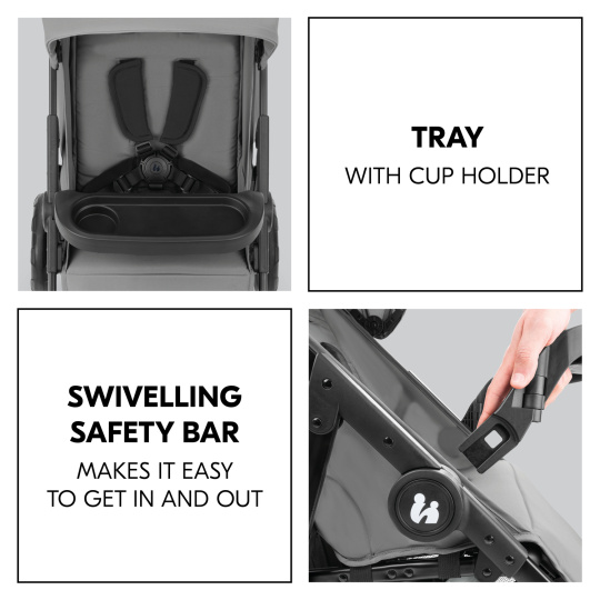 Má vaše dítě rádo svačinky v kočárku? Právě proto je Shop N Care vybaven pultem a držákem na nápoje. Díky otočnému ochrannému oblouku může vaše dítě snadno nastupovat a vystupovat.