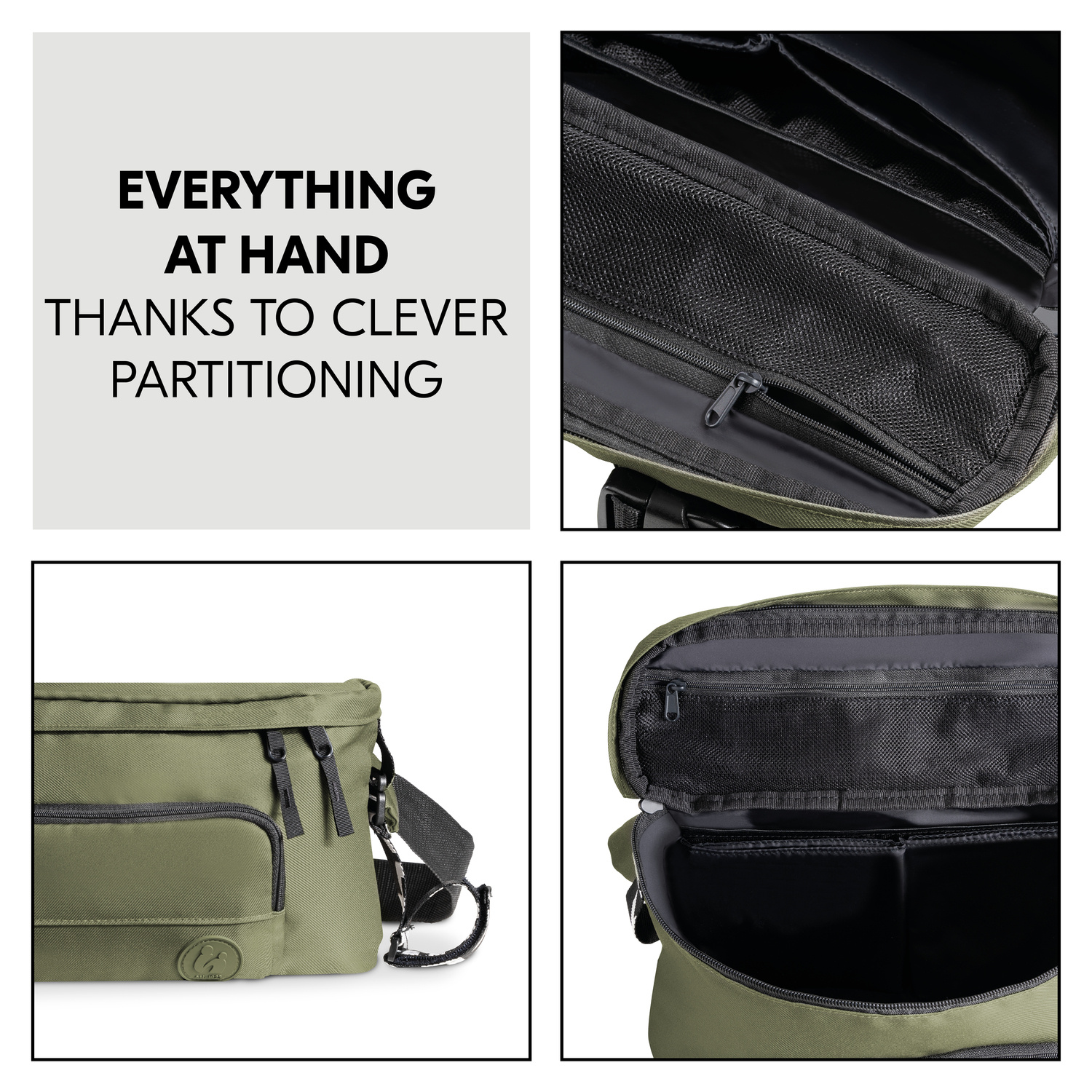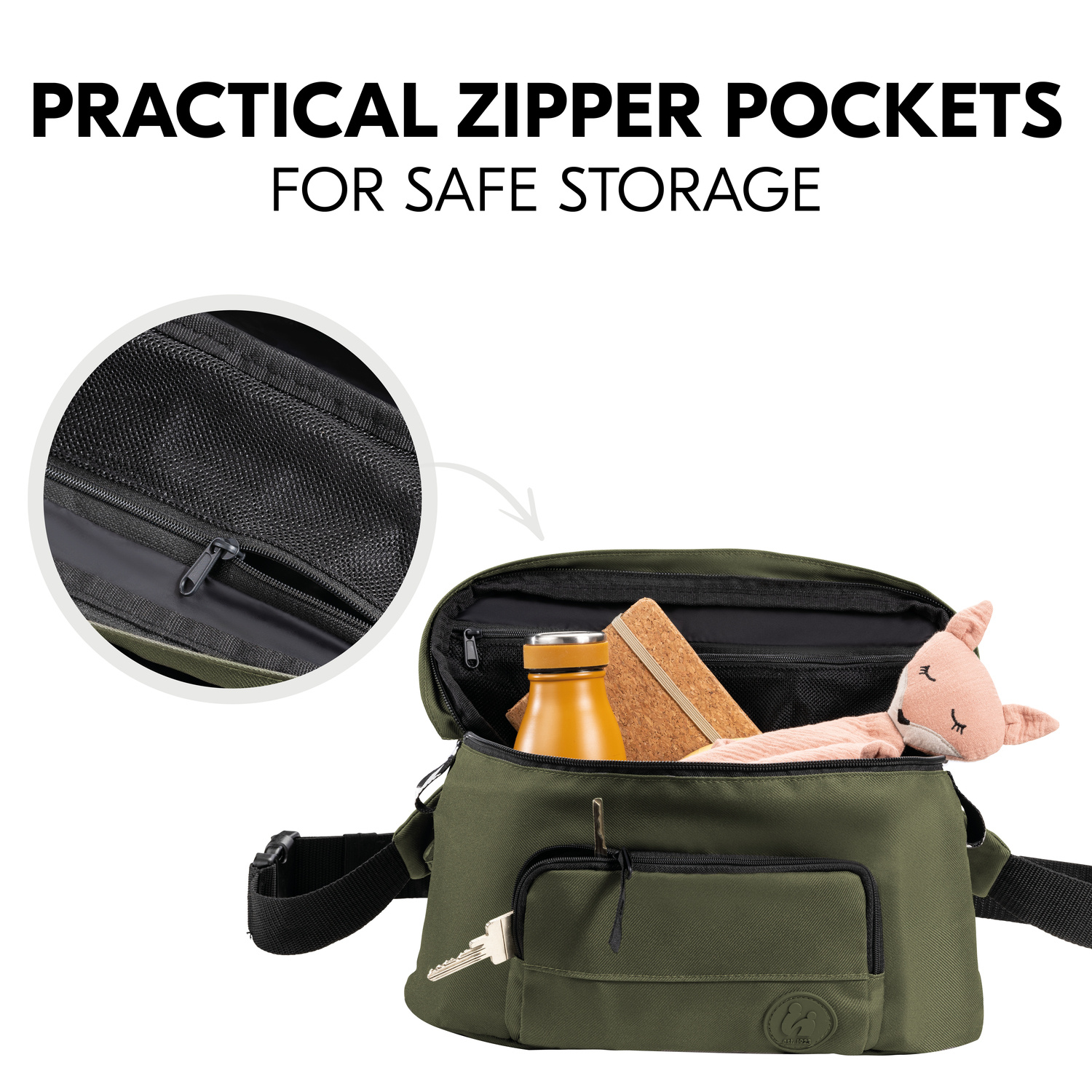 SNADNO & RYCHLE // Organizér velmi snadno a rychle připevníte na kočárek díky nastavitelným suchým zipům. V případě potřeby lze upevňovací pásky odepnout.
