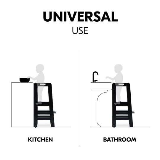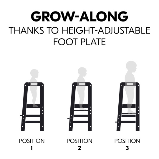 V závislosti na velikosti vašeho dítěte můžete nastavit nožní desku kuchyňského pomocníka do tří různých výšek. Robustní a stabilní konstrukce umožňuje vašemu dítěti používat Montessori věž až do hmotnosti 40 kg, ať už v kuchyni, u jídelního stolu nebo u umyvadla v koupelně.