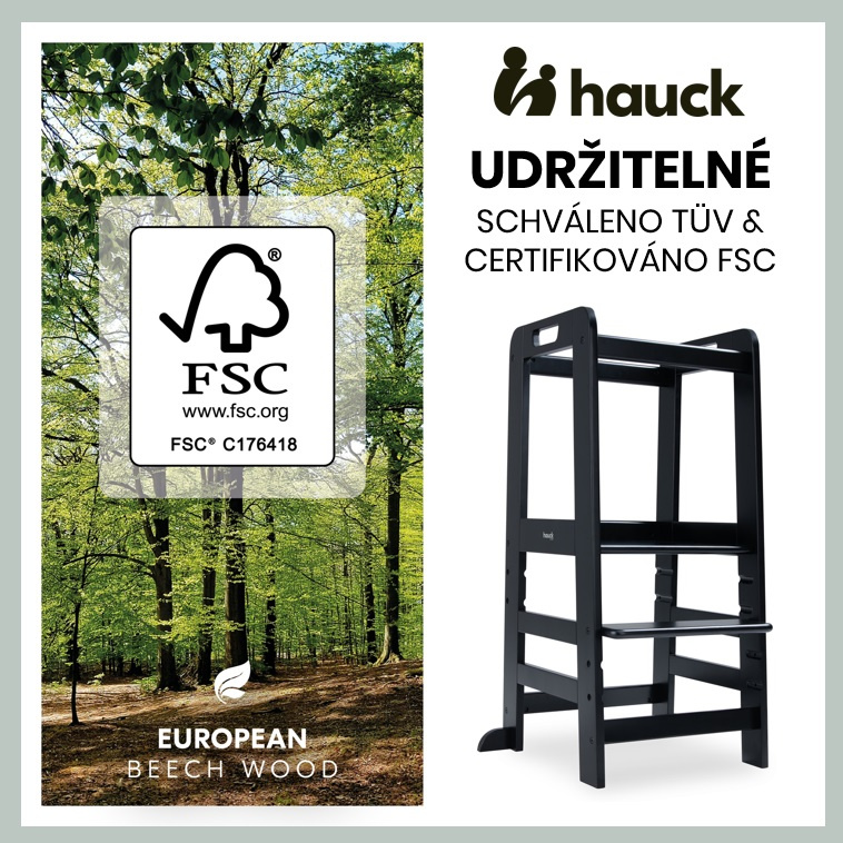 Díky vyvýšené poloze stupínku se může vaše dítě zapojit do běžných rodinných aktivit a pomáhat vám, bezpečně ve výšce očí. V duchu Montessori "Pomoz mi, abych to dokázal sám" se vaše dítě od útlého věku zapojuje formou hry, např. do vaření nebo pečení, a posiluje tak svou samostatnost, jazykový a sociální rozvoj i sebevědomí. Učící Věž pro batolata hauck má certifikát FSC®, což znamená, že bukové dřevo pochází z lesů s certifikátem FSC a šetrným lesním hospodářstvím.