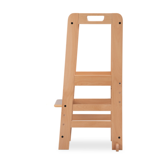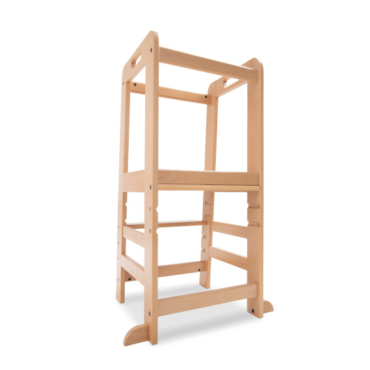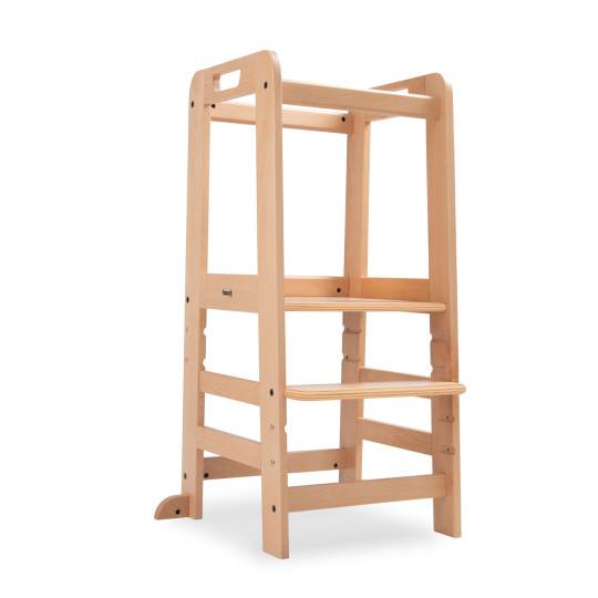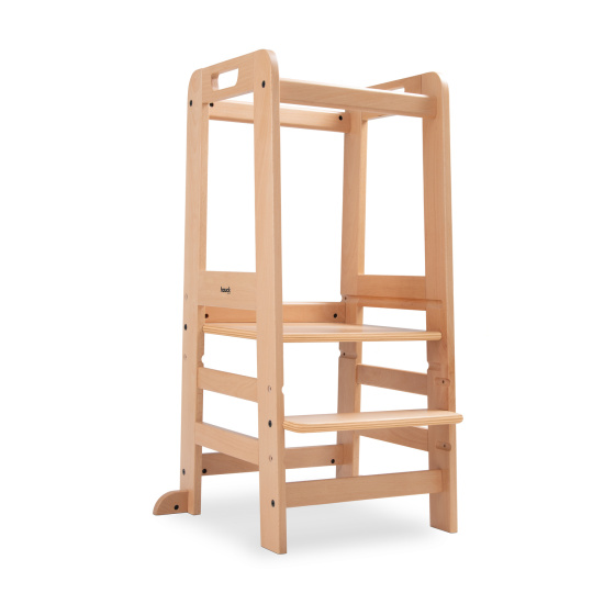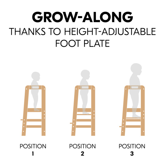V závislosti na velikosti vašeho dítěte můžete nastavit nožní desku kuchyňského pomocníka do tří různých výšek. Robustní a stabilní konstrukce umožňuje vašemu dítěti používat Montessori věž až do hmotnosti 40 kg, ať už v kuchyni, u jídelního stolu nebo u umyvadla v koupelně.