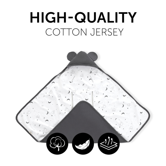 VYSOCE KVALITNÍ BAVLNĚNÝ JERSEY PRO SLADKÉ SNY // Deka Snuggle N Dream je vyrobena z měkkého, vysoce kvalitního, bavlněného Jersey, který dýchá a reguluje teplotu, zabraňuje přehřátí. Kapucka chrání hlavičku miminka před nepříjemným průvanem, ideální pro chladnější letní dny.