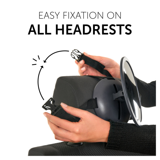 Snadná instalace // Zrcátko lze bezpečně a pevně přichytit pomocí čtyř pásků na každou opěrku hlavy sedadla, a to jak v horizontální, tak ve vertikální poloze podle potřeby. Velké zorné pole vám vždy zajistí dostatek výhledu a kvalitní, nerozbitný materiál snižuje riziko poranění.