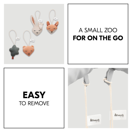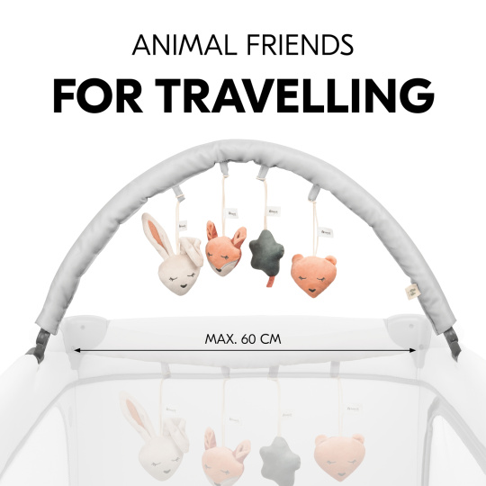 ZVÍŘENÍ SPOLEČNÍCI NA CESTY // Roztomilí zvířecí kamarádi: s roztomilým zvířecími kamarády se bude vaše maličké všude cítit jako doma. Hrací oblouk je ideálním doplňkem k cestovním postýlkám Hauck s ložnou plochou o šířce 60 cm.