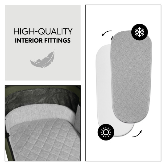 PROSTORNÁ A POHODLNÁ KORBIČKA PRO KAŽODENNÍ PROCHÁZKY JAKO V BAVLNCE // Díky bavlněné podšívce a matraci s letní a zimní stranou se bude vaše maličké cítit jako v bavlnce po celý rok. Díky systému paměťových tlačítek odpojíte korbičku z konstrukce snadno a rychle jednou rukou.