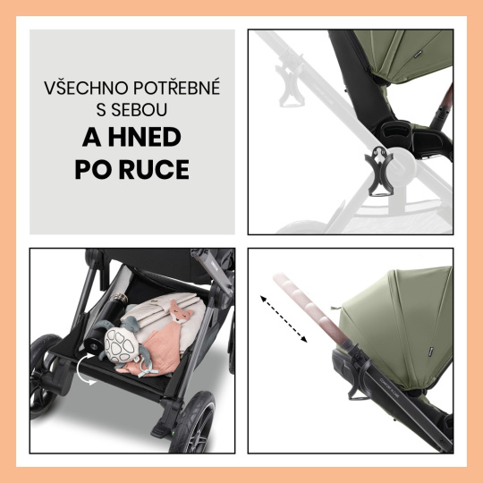 VŠE S SEBOU - A PO RUCE // Díky praktickému držáku na nápoje na výškově nastavitelné teleskopické rukojeti máte svůj nápoj vždy po ruce. Vše, co vy a vaše maličké budete potřebovat, se vejde do extra velkého výklopného koše!