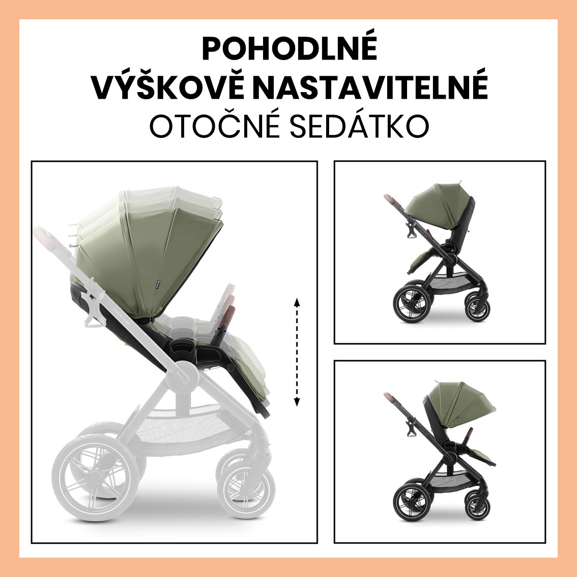 POHODLNÉ SEDÁTKO SE DVĚMA SMĚRY POHLEDU // Na zmrzlinu, na kávu či do parku: všude se vám kočárek dokonale přizpůsobí díky výškově nastavitelnému otočnému sedátku, navíc s extra dlouhým sezením a polohováním poskytuje maximální pohodlí v každé situaci.