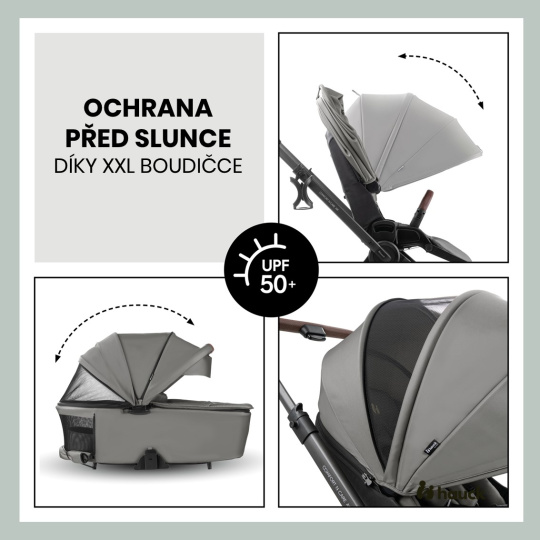 XL STŘÍŠKA PRO MAXIMÁLNÍ OCHRANU PŘED SLUNCEM // Sedátko i korbička mají prodloužitelnou sluneční stříšku s ochranou proti UV záření 50+ a velká síťovaná okénka. Díky tomu je vaše děťátko optimálně chráněno, a přitom má neustálý přísun čerstvého vzduchu.