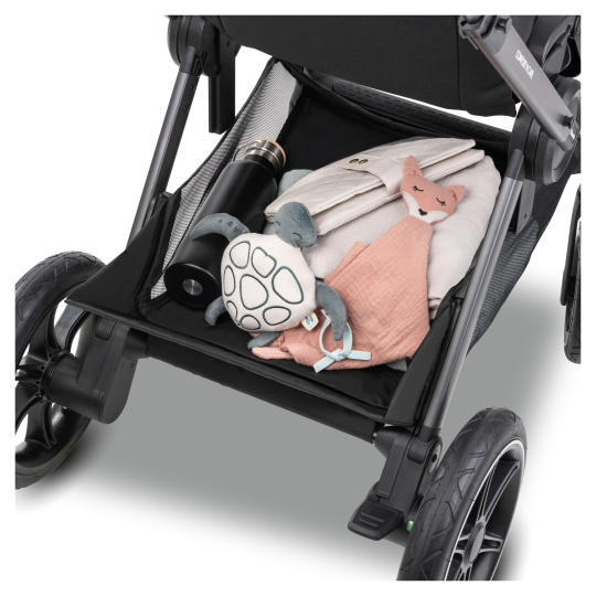 Bezpečné a pohodlné cestování - Nafukovací kola do každého terénu jsou připravena na každý výlet. Odpružení 4x4 jemně pohupuje vaše děťátko, prodloužitelná XL sluneční stříška (s UV 50+) nabízí ochranu před každým počasím a XL panoramatická síťovaná okna zajišťují čerstvý vzduch. Sedátko kočárku má výškově nastavitelné 5bodové bezpečnostní pásy, dobře polstrovanou, extra vysokou opěrku zad a nánožník.