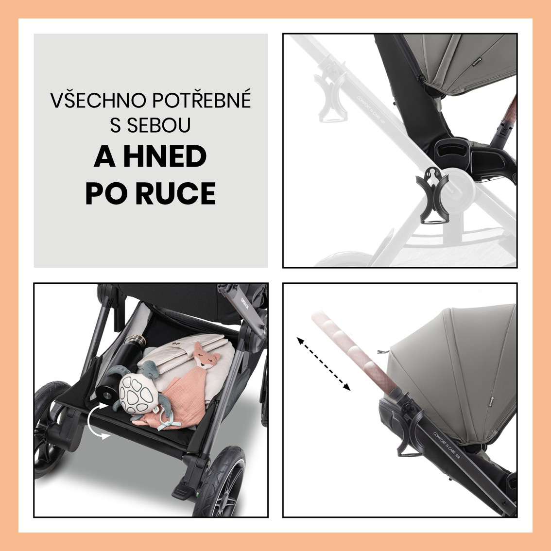 VŠE S SEBOU - A PO RUCE // Díky praktickému držáku na nápoje na výškově nastavitelné teleskopické rukojeti máte svůj nápoj vždy po ruce. Vše, co vy a vaše maličké budete potřebovat, se vejde do extra velkého výklopného koše!