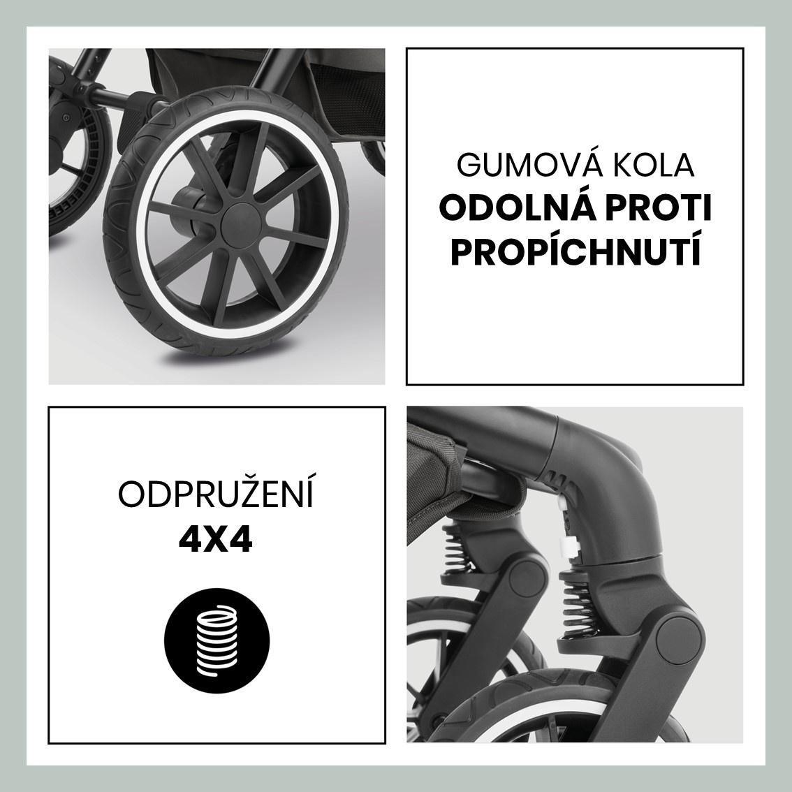 Díky gumovým kolům do každého terénu jste vybaveni na všechny cesty. Odpružení 4 x 4 jemně pohupuje vaše děťátko, zatímco prodlužovací XL sluneční stříška (UV 50+) chrání vaše děťátko za každého počasí a síťovaná okénka zajišťují čerstvý vzduch. Sedátko kočárku má výškově nastavitelné 5-bodové bezpečnostní pásy a dobře polstrovanou, extra vysokou opěrku zad. Opěrka nohou roste s vaším dítětem.