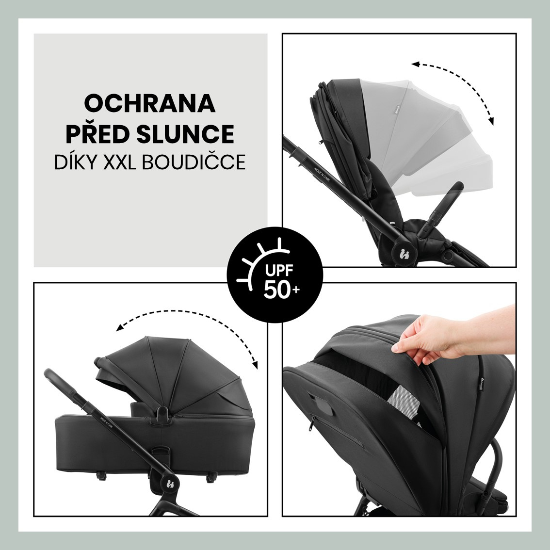 XL BOUDA S MAXIMÁLNÍ OCHRANOU PROTI SLUNCI // Sedátko i korbička jsou vybavení prostornou boudou s prodloužením s UV 50+ ochranou a síťovaným okýnkem. Takto je vaše maličké optimálně chráněno a může si užívat dostatečný přísun čerstvého vzduchu po celý čas.