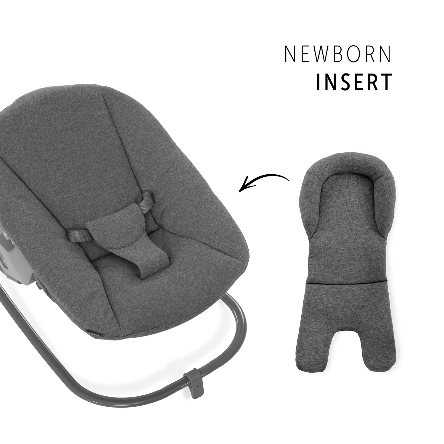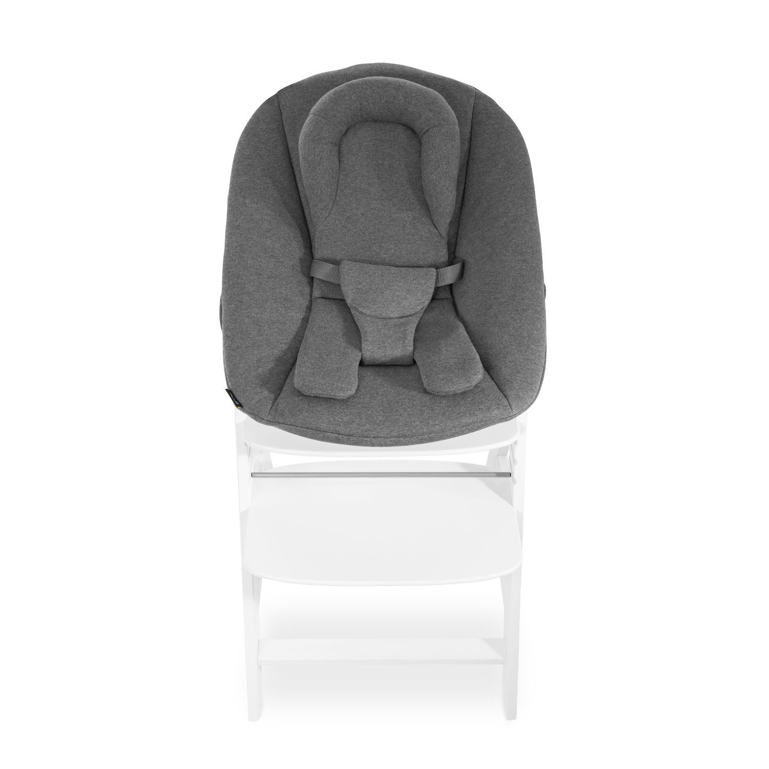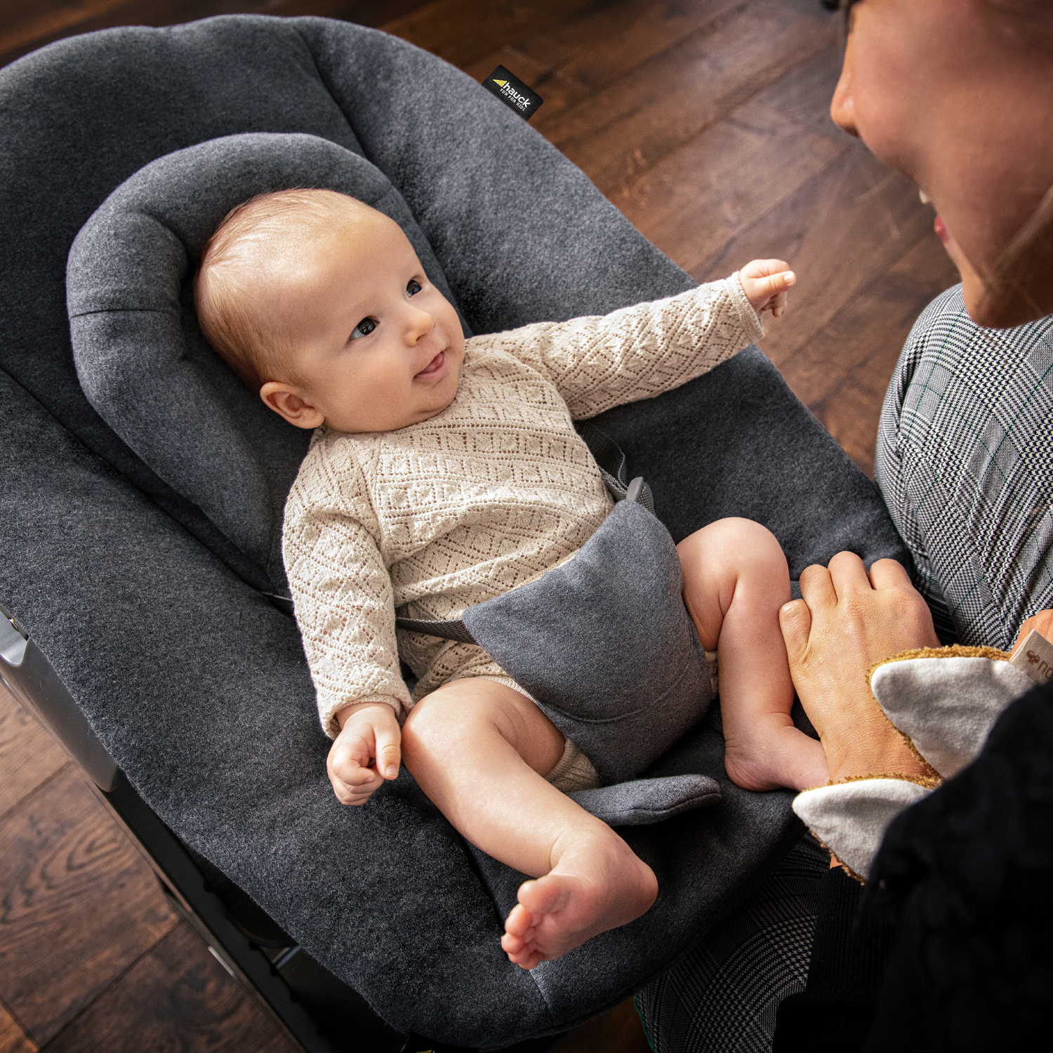 Pro novorozence použijte měkké vnitřní přídavné polstrování sedátka se zesílenou opěrkou hlavy. Polstrovaný 3-bodový pás miminko dokonale zabezpečí. Pokud si děťátko žádá změnu, lze nástavec pro novorozence jednoduše upevnit na houpací stojan a rázem se pomocí několika tahů vykouzlí prémiová kolébka, která se může buď houpat spolu s přirozenými pohyby miminka, nebo se jednoduše zajistí.