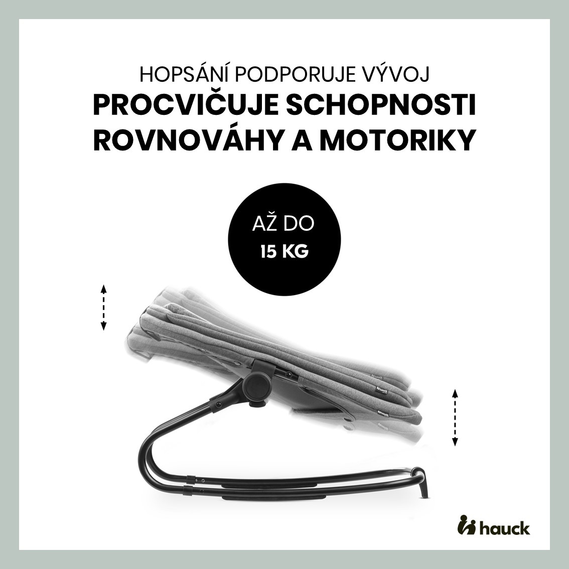 „Hopsání“ pomáhá rozvoji! Vaše dítě si procvičuje rovnováhu a motorické dovednosti. Může hopsat, kolébat se a odpočívat v křesílku až do 15 kg, nebo do 9 kg při použití jako novorozenecký nástavec na dřevěnou židličku.
