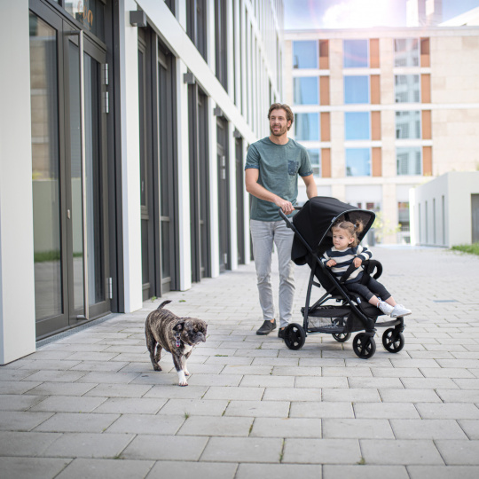 Prostorný lůžko na ležení, lze nastavit v několika polohách do roviny, sluneční stříška lze nastavit daloko dopředu, ideální společník pro starší děti,